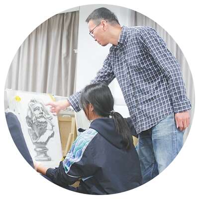 宁波美术学校教师汪潜(右)指导综合高中班学生练习素描。钱佳玥摄