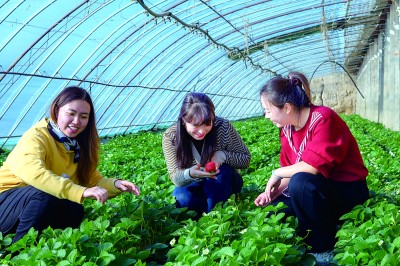燕鸽村的设施温棚里,游客在体验草莓采摘。朱立民摄/光明图片